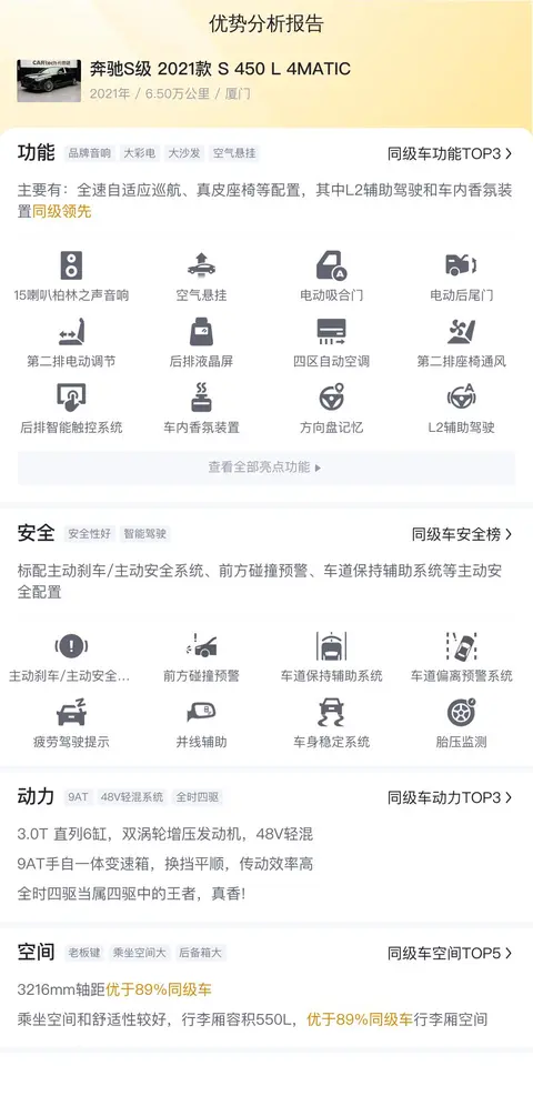 市场行情方面,该车的售价在二手车市场上相对较高。考虑到其车况、里程数和过户次数,这款车的售价在市场中并不算低。不过,由于奔驰S级S 450 L 4MATIC的保值率较高,且市场需求稳定,因此其售价仍有一定程度的市场认可度。如果您正在寻找一款车况良好、里程适中的二手奔驰S级,那么这辆车或许是一个不错的选择。但是,我们暂时没有这辆车的《检测报告》,无法对车辆的车况进行详细评估。建议您在购买前,向卖家索要《检测报告》,或者实地试驾体验,认真检查车辆的各项状况,确保自己满意再做决定哦!
