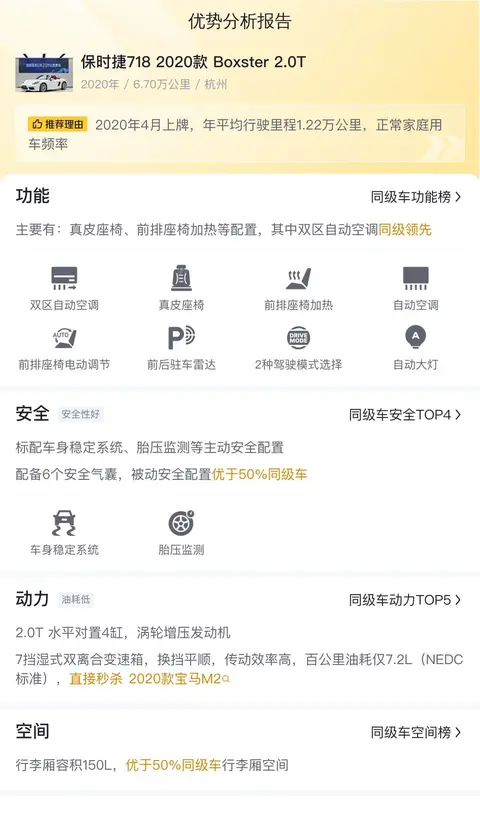 这款二手保时捷718 Boxster 2020款 Boxster 2.0T在动力性能和配置方面表现出色,是一款值得考虑的入门级豪华跑车。然而,由于车辆已经行驶了6.7万公里且有过一次过户记录,潜在买家应该仔细检查车辆的状况,特别是底盘、悬挂和制动系统的磨损情况。此外,保养和维修成本可能相对较高,也需要纳入考虑范围。尽管如此,这款车仍然适合那些追求驾驶乐趣和豪华体验的消费者,尤其是年轻专业人士和跑车爱好者。在购买前,建议潜在买家进行全面的车辆检查,并与卖家充分沟通,了解车辆的完整历史和当前状况。同时,也可以考虑与专业的二手车经销商合作,以获得更多的车辆信息和支持。总之,这款车是一款不错的入门级豪华跑车,但在购买前需要谨慎考虑和充分了解。