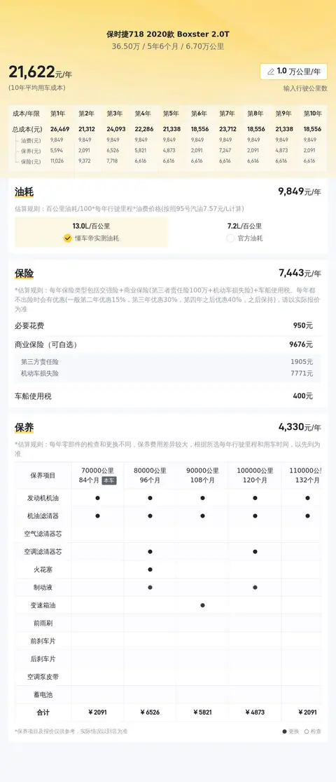 根据懂车帝的数据,这款保时捷718 Boxster的市场行情较好,因为本车没有检测报告,所以综合性价比指数为61%,单从性价比来看,这辆车并不算高,但是作为一台保时捷跑车,他的热度还是很高的,过去半年的询价量高于同级车均值114%,而且这个热度仍在上升中。在用车成本方面,这款车的官方百公里油耗为7.2L,按照每年行驶2万公里计算,每年的油费约为14400元。保险费用方面,每年约需11477元,包括交强险、商业险等。保养费用方面,每年约需4108元,包括常规保养和零部件更换等。其他费用方面,每年约需400元,包括车船使用税等。因此,这款车的10年平均用车成本约为30385元/年。