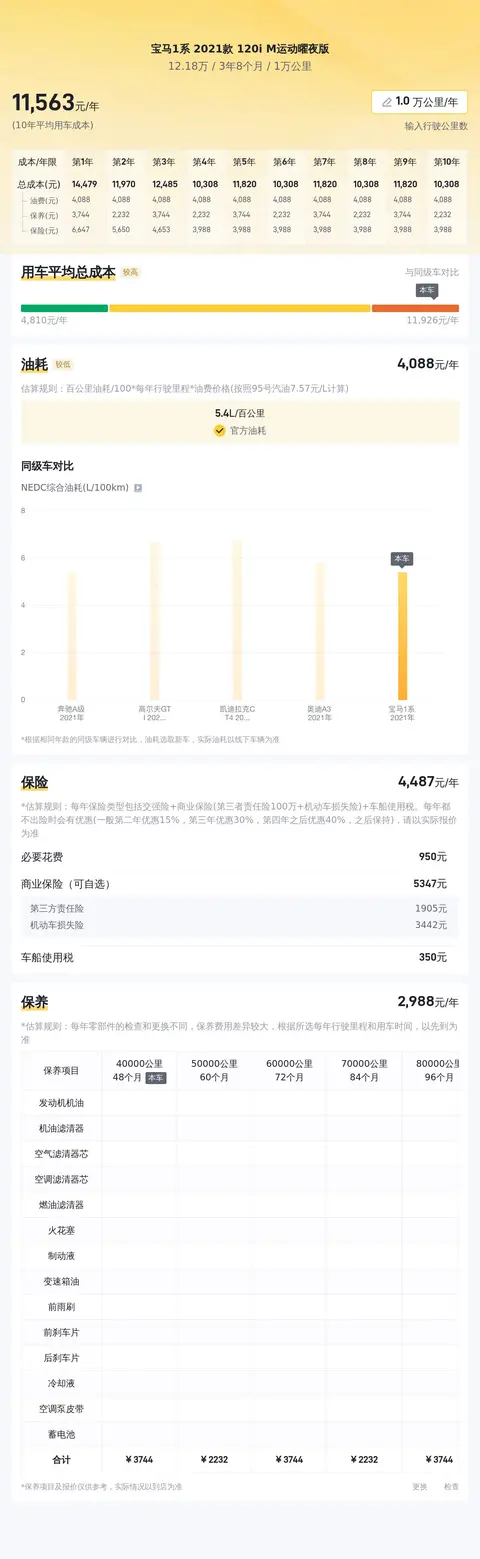 用车成本方面,按一年行驶一万公里计算,该型车每年燃油、保险及保养的综合用车成本约11746元,具体费用要看用车频率及使用环境而定。