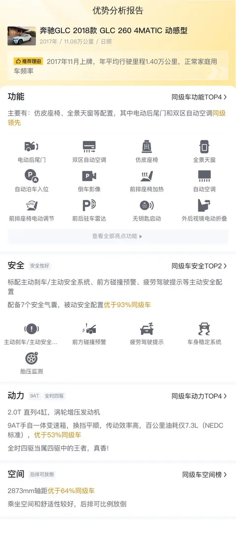 综上所述,这辆日照牌照的二手奔驰GLC 2018款 GLC 260 4MATIC 动感型在售价、车况、配置、性能、空间等方面均表现出色。12.88万的售价低于全国相似车型成交均价,保值率高于同级车,1.61万元/年的用车成本合理适中,7.3L/100km的油耗水平较低。配备的电动后尾门、双区自动空调、主动刹车/主动安全系统等配置提升了用车舒适性和安全性。2.0T发动机配合9AT变速箱和全时四驱系统提供了出色的动力表现。2873mm的轴距和可比例放倒的后排座椅满足了宽敞舒适的乘坐空间和储物需求。这辆车无疑是一个性价比高、值得考虑的选择。然而,由于该车尚未进行第三方检测,潜在买家在做出购买决定前,建议到场试驾并评估车况,以确保满意。