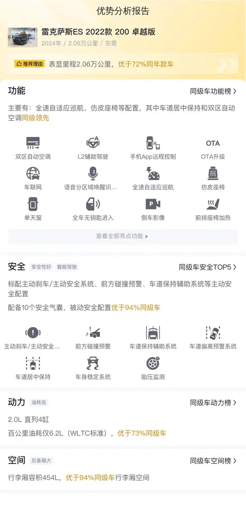 综上所述,这款二手雷克萨斯ES 2022款 200 卓越版在配置、性能、舒适性和安全性等方面都有着不错的表现。如果您正在寻找一款高品质的豪华轿车,不妨考虑一下这款车型。当然,在购买二手车时还需要注意车辆的实际情况和卖家的信誉等因素。